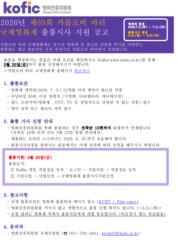 2026년 제60회 체코 카를로비 바리 영화제 출품시사 지원공고(3.16.(월)~3.20.(금))
